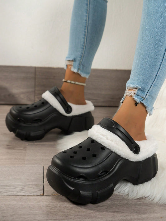 Winter Round Toe Plush Lined White Outdoor Fashionable Sandals With Thick Eva Sole, Casual Hollow Perforated Shoes
