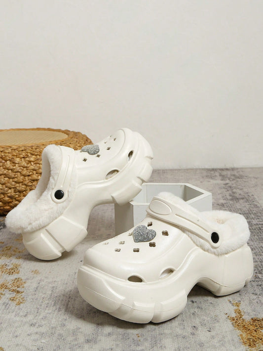 Winter Round Toe Silvery Heart-shaped Warm Shoes With Fleece, Basic Black Flat Sole & Simple Outdoor Sandals For Casual Match, Thick Eva Hollowed Shoe For Women